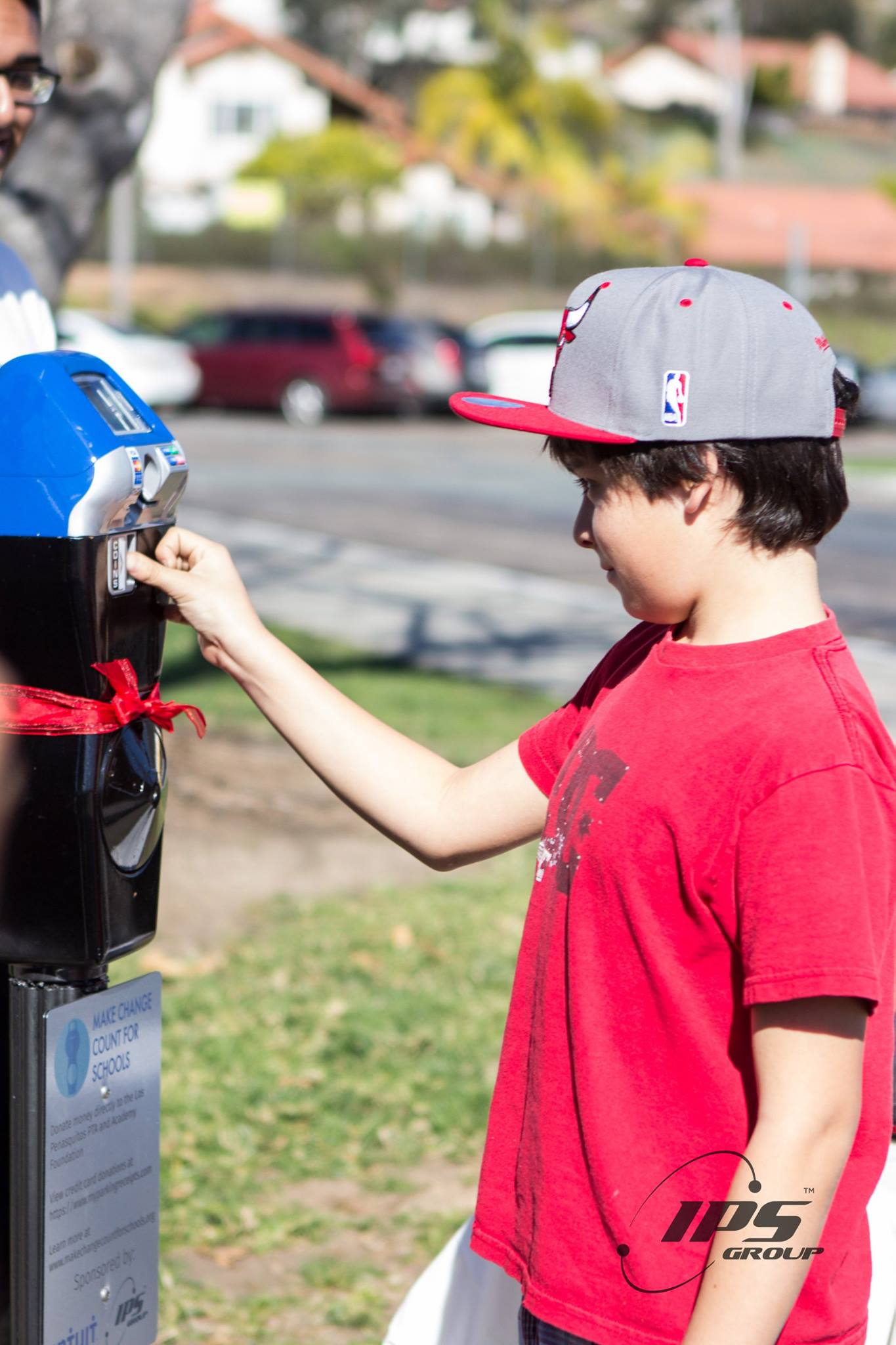 The inaugural donation meter is part of the “Make Change Count for Schools” program, the brain child of three local students who merged technology and fundraising to create a convenient and effective funding platform for local schools. The program takes its inspiration from the San Diego Downtown “Make Change Count” program which uses locally-manufactured smart parking meters that accept debit/credit card payments to facilitate charitable donations. Technology provider IPS Group, Inc., headquartered in San Diego, donated the meters and necessary ongoing merchant gateway costs to the “Make Change Count for Schools” program.