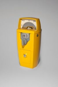The lone parking meter (here painted in original Cale yellow) was designed in 1966 by Swedish manufacturer, Per Heribertson, who belonged to the first generation of industrial designers in Sweden. The meter was a well-known item in the urban streets of Sweden for most of the 20th century. His famous design not only gave the user clear guidance on the function of the device, it also brought an industrialized modularity to allow high volume production and simplified maintenance and repairs.