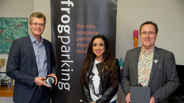 Picture: From left are Skidata chief executive Hugo Rohner, Frogparking managing director Shareena Sandbrook and Frogparking chief executive Don Sandbrook. Picture by Murray Wilson/ Fairfax NZ.