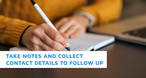 During presentations jot down speaker details so you can request slides and follow-up on questions later. Think about all the business cards you collect at a typical tradeshow and create a separate document for these.