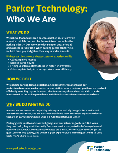 You don’t want drivers waiting behind a closed gate until a parking employee or enforcement officer can be summoned to handle the situation. That’s where the Parker Technology solution comes in – a robust customer service platform, with on-demand virtual ambassadors.