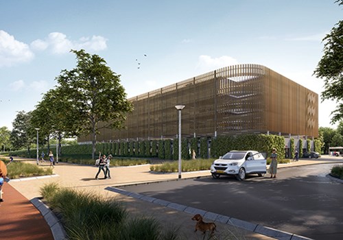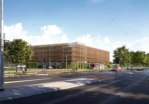 For the fit in the surroundings of Genneper Parken, the lower part on the outside of the garage will be covered with ivy. The floors above are open and get a natural look through slats made of sustainable material. By using solar panels, the garage will be delivered energy neutral.