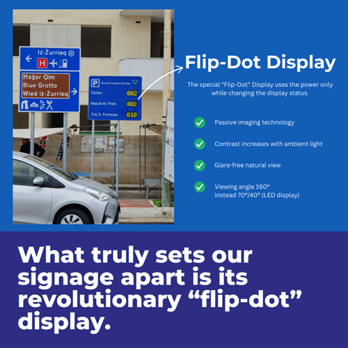 Four compact and completely wireless Guidance Signages were installed, each powered by integrated solar panel sticks for maximum efficiency. With a simple plug-and-play setup—just like installing a regular traffic sign—they’re designed to be as user-friendly as possible. What makes them truly stand out is their cutting-edge “flip-dot” display, delivering live occupancy updates for three key streets. These signs not only help drivers make smarter decisions but also reduce circling traffic, making a real difference in easing congestion in the heart of Zurrieq.