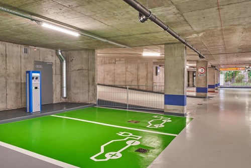 There are 284 parking spaces available in the multi-story car park spread on four floors. Some of them are designed for residents and customers using the long-term pre-paid parking option, some of them are reserved for visitors. The car park is also equipped with toilets, reserved parking spaces for natural gas vehicles and electric car charging stations.