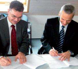 Photo: Both Managing Directors, Stefan Forster (Hectronic, left) and Nikolaus Gräf (Dunkermotoren) sign the cooperation agreement.