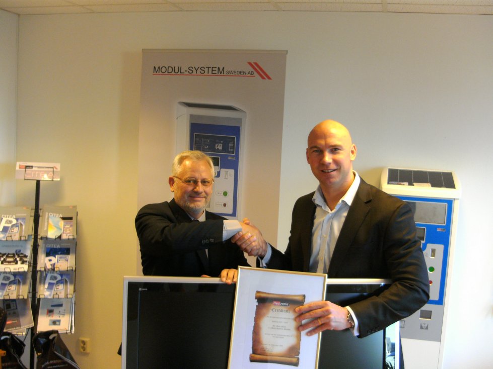 We have our winner! Modul System, our Swedish partner has won the sales competition and Mats Monié is very pleased with his well earned flat screen TV. During a visit to Sweden, Wolfgang Stanek, Head of Parking and Stefan deBoor, Head of Sales, congratulated the winner and presented him with the TV. "Wow, that is a fantastic surprise," beamed Mats Monié when he received his pre-Christmas present.