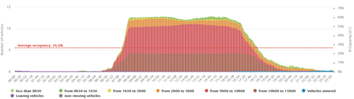 In the same area during the semi-confinement, we noticed an increase of the occupancy level from 84% to a near-constant level of 93.4% and a decrease in car turnover rates from 7.2 to 3.2 cars per day. This data reveals that fewer residents were leaving their homes to go to work i.e. home office (grey colored). The graph also shows no evening parking fluctuation with bars and restaurants being closed.