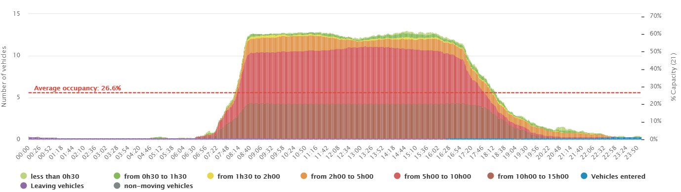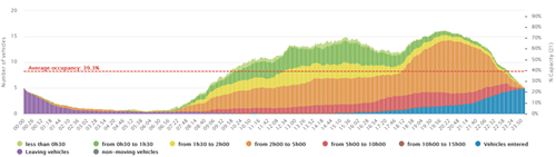 - Turnover rate: The average number of vehicles using the same parking space over a specific period.