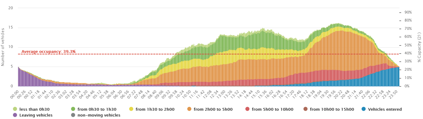 Before the confinement period, we observed an average occupancy level of 39.3% with peaks during office and evening hours and an average car turnover rate of 5.7 cars per parking space per day. High occupancy rates decrease at the end of working days and quickly increase again with people going to restaurants, bars, and cultural places.