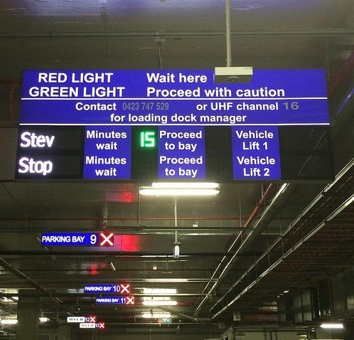 Melbourne, Australia – INDECT created a loading dock management system for a busy city department store with a subterranean loading dock. The dock was only accessible via a one-way lane and elevator that brought freight trucks into a basement area. INDECT was able to interface to the elevator and create a queuing system for entry and exit to the area by elevator. They also interfaced with the existing LPR system to capture images of the license plates and displayed these plates on a matrix sign. This allowed the store to allocate specific loading bays to individual trucks. INDECT also created a number of oversized, lightweight, backlit vinyl signs that were able to be used both indoors and outdoors.