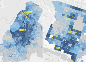 Looking at the full city map for Austin (Map A) there is a clear concentration of high-scoring census block groups in and around downtown, where unsurprisingly the concentration of origin and destination trips per zone are high. However, there are several areas outside of downtown that would be worth further exploration for HAV deployment. This includes Spicewood Springs Road from the North Capital of Texas Highway toward Crestview (Block Group Chain 1), and Rosedale, just north of Central Austin (Block Group Chain 2).