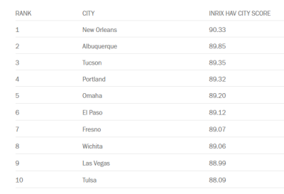 To see what urban areas could have the greatest proportion of vehicle travel replaced by HAVs, INRIX looked at one year’s worth of travel – nearly 1.3 billion trips – in and around the top 50 U.S. cities by population. Combining INRIX data and StreetLight InSight, an industry-leading mobility analytics online platform from partner StreetLight Data, INRIX Research analyzed trips that began and ended within a 25-mile radius of each downtown and compared this to aggregate regional trips (including outbound, inbound, and passing-through trips) to establish a percentage of intra-city travel. INRIX then looked at the percentage of a city’s intra-city trips, 10 miles or less, and combined these two metrics to score each city out of a possible 100 points.