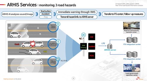 Audio-AI based Road Hazard Information System (ARHIS) is a solution that allows AI to check and respond to road hazards such as icing (including black ice) and wetness by analyzing driving sounds and determine road surface conditions in real time. It also detects car accidents based on Skid, Crash sound to prevent collateral accidents. Fog detection feature will be added in 3Q 2024.