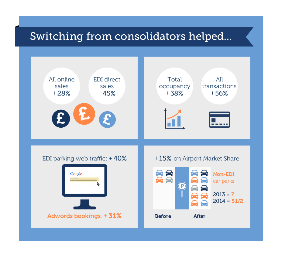 Recent stats for Edinburgh, Scotland’s busiest airport who moved away from the traditional consolidator model shows that over the 12 month period on-line sales rocketed by 28% and on-airport parking market share was up 15%.