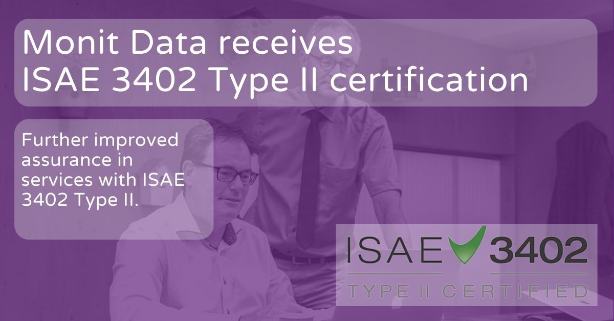 As part of our compliance program, Monit Data is ISAE 3402 certified. The Type I certification was achieved earlier, but the more extensive Type II certification has now also been added.