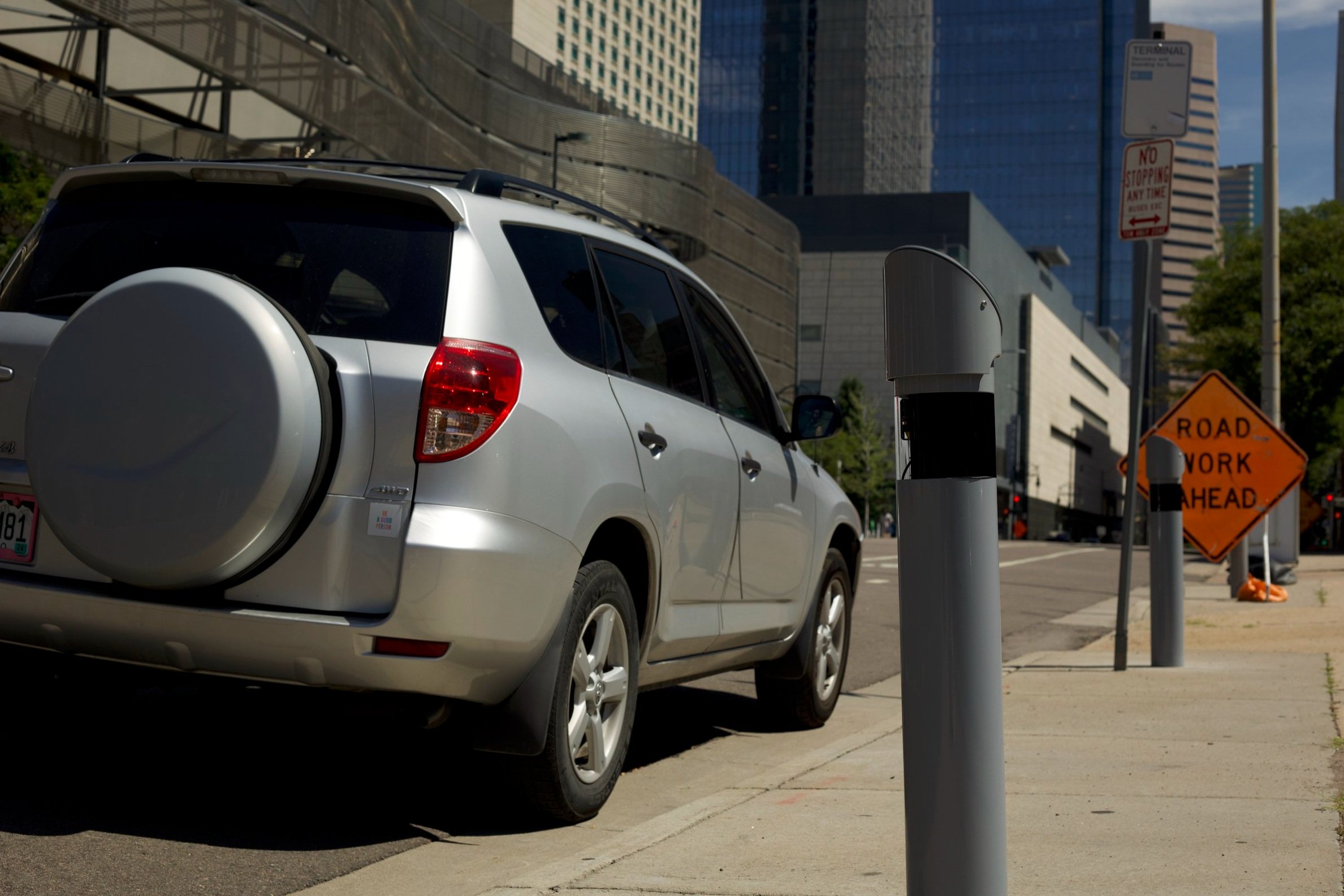 These gray poles, about 42 inches tall, have a camera inside and transmit time-stamped photos of vehicles and their license plates to MPS company offices, where employees review the photos and send out citations to the offenders based on vehicle registration information.
