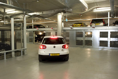 Typically for Amsterdam, access to the underground garage is below sea level. A conventional underground garage with ramps over several underground floors would not only have involved excessive building costs, but also meant a building time that was unacceptable to the investor.