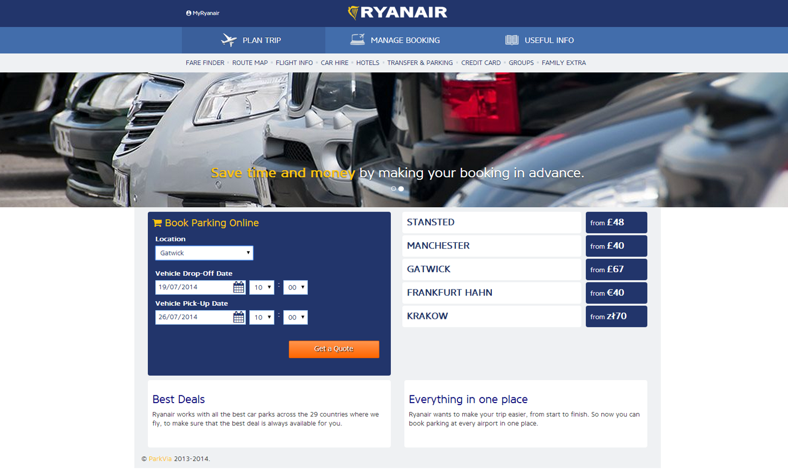 ParkCloud first partnered with low cost pioneer Ryanair in March 2013, offering parking reservations through a dedicated white label site and also directly integrated into the Ryanair flight booking process at Ryanair.com.