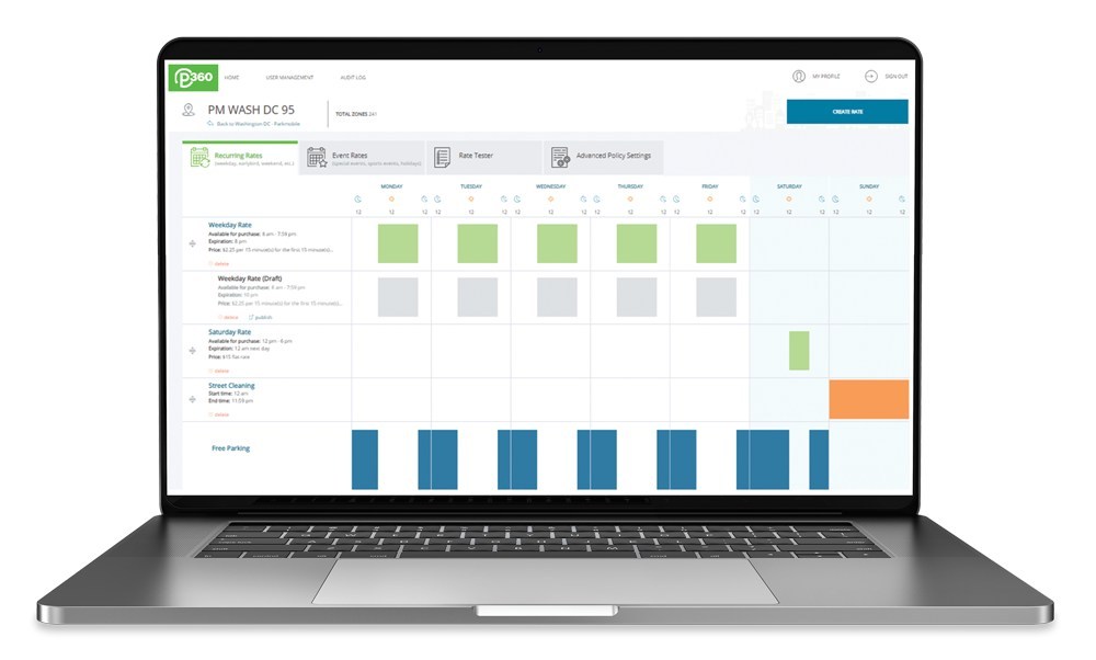 - Intuitive Calendar-Based Interface: Access daily and weekly views of recurring rates and policies, making it easy to visually see all paid parking, no parking and free parking rate structures.