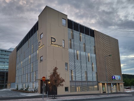 The parking facility has a total of 440 parking spaces on 7 floors. The building mainly gets its electricity from its own 58 kW solar power plant – there are a total of 140 solar panels on the building’s green roof. For EV-charging there are 26 dedicated parking spaces with charging points.