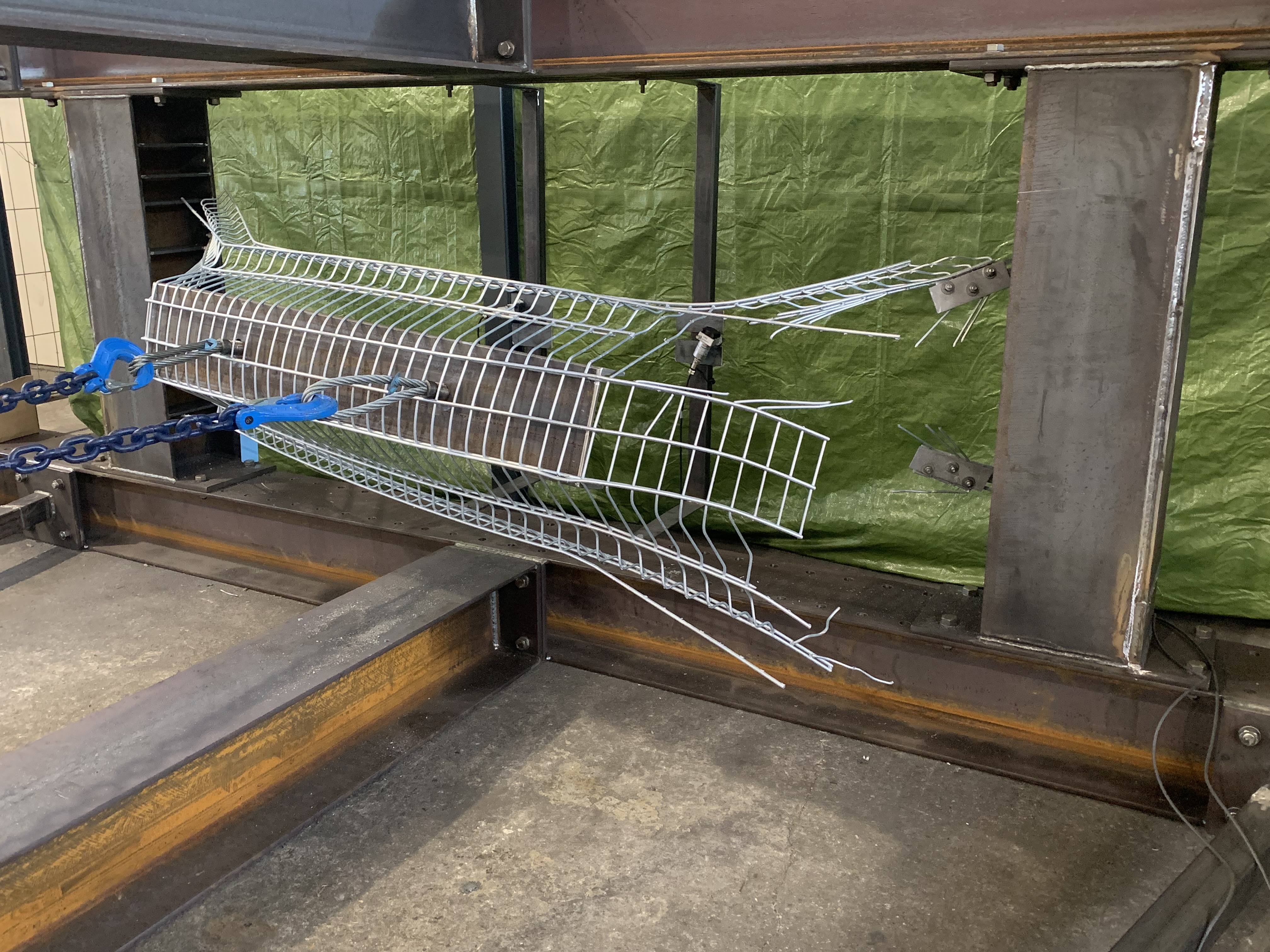The steel mesh mat to be tested is clamped between two support beams. A special steel profile – designed to simulate the bumper and impact surface of a vehicle – is placed on the mat. The system is then loaded step by step until the mat fails. High-precision displacement gauges record the deformation, while a load gauge measures the impact force applied. The result: reliable data on the force-deformation behaviour of our system – and thus a solid basis for safety-related assessments in the planning stage.