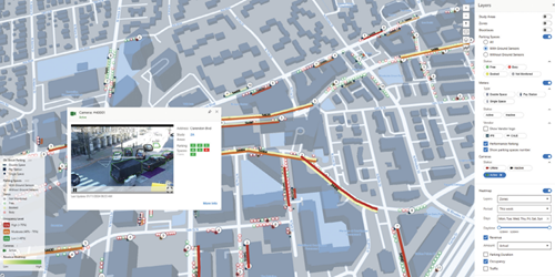 the project, Umojo’s NexCity Solution integrated with the in-place digital payment platform, two different meter hardware systems, in-ground parking sensor technology, and the existing County ITS camera infrastructure. The data collected established the required baseline and utilized the NexCity camera AI platform to identify and measure parking violations or overstays. The overstays are highlighted below in RED to signify a violation