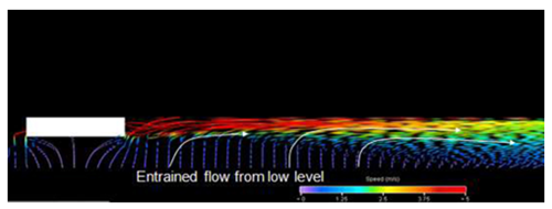 In Figure 5 we see an illustration of low level air entrainment as modeled using CFD. The white rectangle represents a Jet Thrust fan; note the high velocity (red) air that diffuses the farther it flows. The air is picked up by the next fan until all that air is pushed through a port hole.