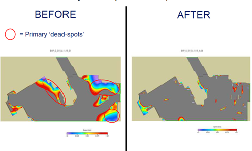 Figure 6 shows an example of the iterative CFD analysis process. On the left, the areas circled in red indicate dead spots where air is stagnant. On the right, after the Jet Thrust fan is added, the dead spots have been almost totally eliminated.