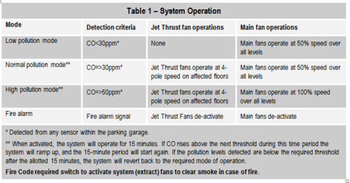 The new underground parking garage ventilation system includes a control system that links all components, including the supply, exhaust, and thrust fans, the carbon monoxide (CO) sensors, and the variable frequency drives (VFDs). Multiple fans can be controlled by one VFD, for example, there might be one VFD for each garage level. VFDs and CO sensors are zoned, and the fans do not have to operate 24/7. Table 1 shows how the system operates in various ventilation modes.