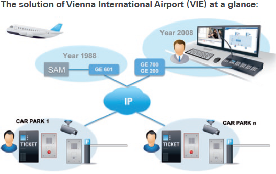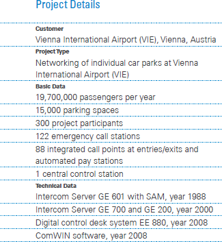 The first phase of the project comprised fitting the parking system at Vienna International Airport with GE 601 Intercom Servers with SAM. The SAM system was integrated in 1988 to allow for full control of the CCTV equipment -- a function for which Commend had developed a special software. The result was a central system with a control station linking the individual parking facilities.